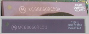 Die CPU 68060 ist in unterschiedlichen Strukturgrößen hergestellt worden. Diese sind als Masken-Nummern auf die CPU aufgedruckt. Je nach Maske wird die Wärmeabgabe beeinflusst. Einige haben sogar Fehler….