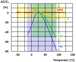 Die Temperaturabhängigkeit von Klasse-1-Keramikkondensatoren wird im allgemeinen Sprachgebrauch in der Industrie nach Bezeichnungen wie „NP0“, „N220“ usw. in Kategorien unterteilt.